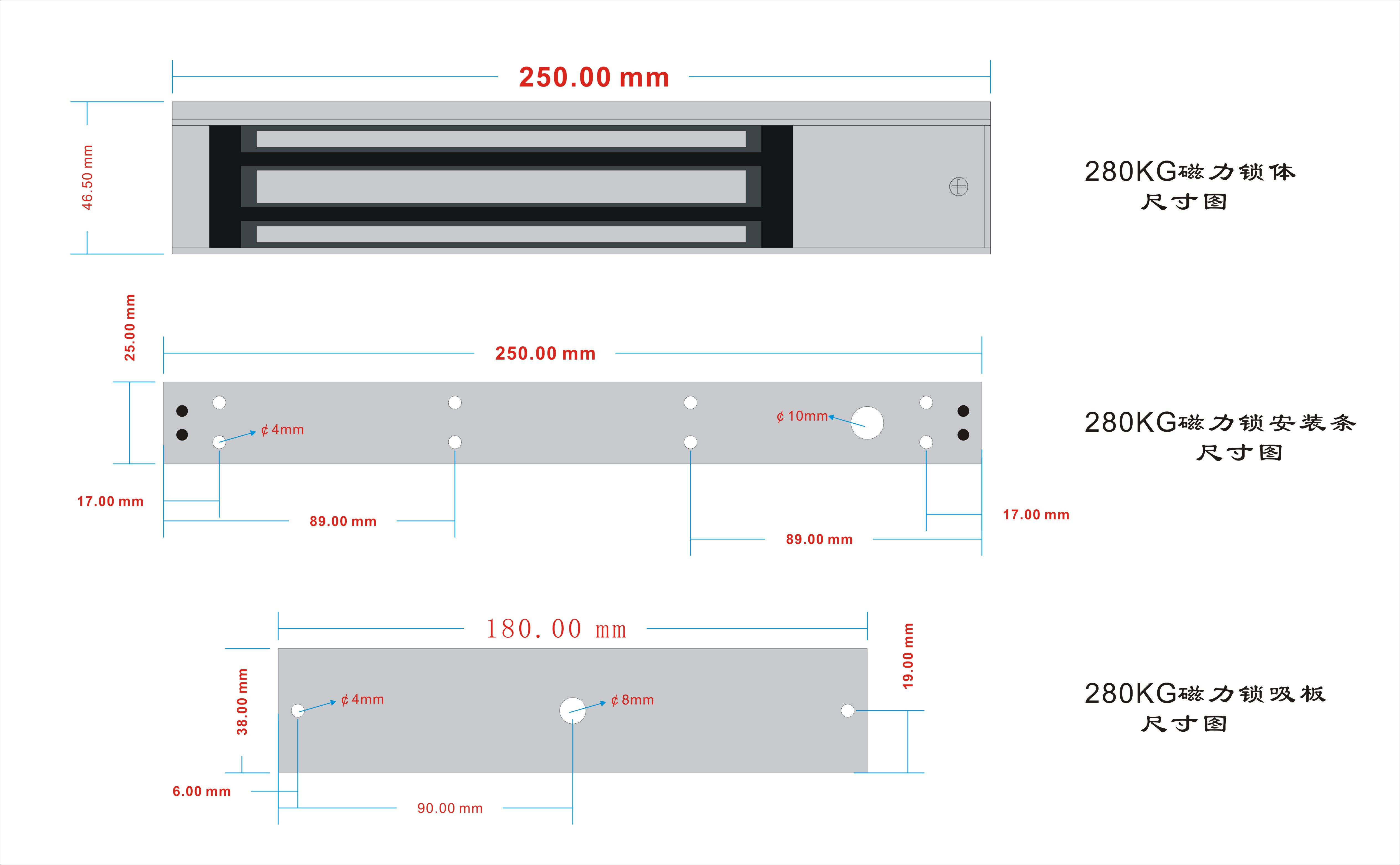 | ◆ 鎖體尺寸:長250x寬48x厚26(mm) | ◆ 吸板尺寸:長180x寬38x厚11(mm) |